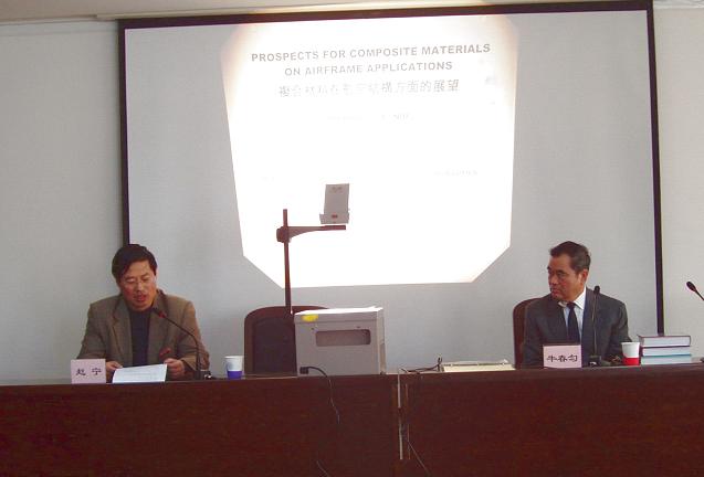 2006年4月27日上午,艾笛航空结构顾问公司总经理、公司客座教授牛春匀教授,在航空宇航公司报告厅,作了题为“复合材料在航空结构方面的展望”的精彩学术报告。报告会由航空宇航公司副经理赵宁教授主持,参加报告会的还有前董事长朱剑英教授及航空宇航公司师生近两百人。