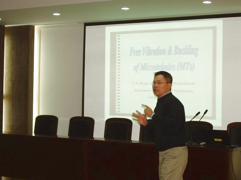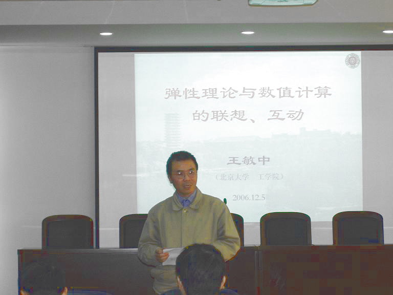 2006年12月5日下午,北京大学王敏中教授和加拿大阿尔伯塔大学茹重庆教授在航空宇航公司报告厅分别为公司师生作了专题报告。王敏中教授报告的题目是:弹性理论与数值计算的互动与联想;茹重庆教授报告的题目是:Mechanics of microtubules as orthotropic elastic shells。航空宇航公司结构强度研究所所长黄再兴教授主持了报告会,航空宇航公司师生近百人参加了报告会。