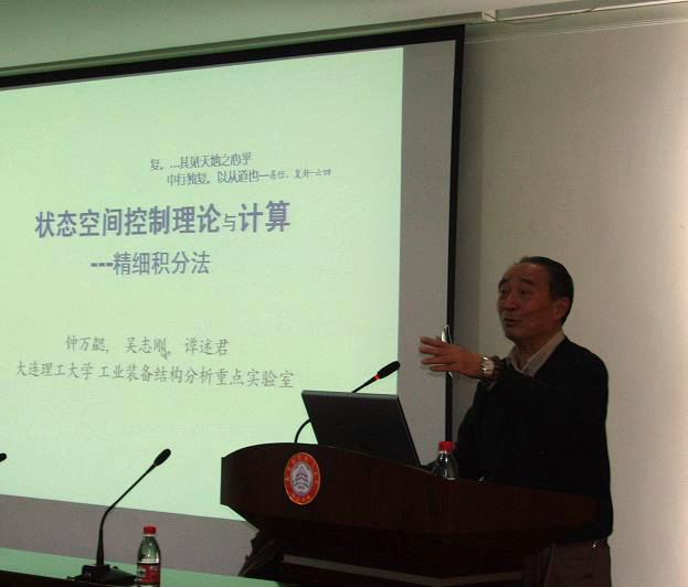 2007年4月14日下午,在航空宇航公司学术报告厅,中国科公司院士、著名工程力学与计算力学家钟万勰教授,为公司师生作了题为“状态空间控制理论与计算―精细积分”的精彩学术报告。之后,钟万勰院士的谭述君博士及助手吴志刚教授,分别作了“基于精细积分的最优控制系统程序包PIM-CSD”及“应用精细积分方法求解卫星编队重构控制问题”的报告。航空宇航公司经理许希武教授主持了报告会,全校近两百名师生参加了报告会。