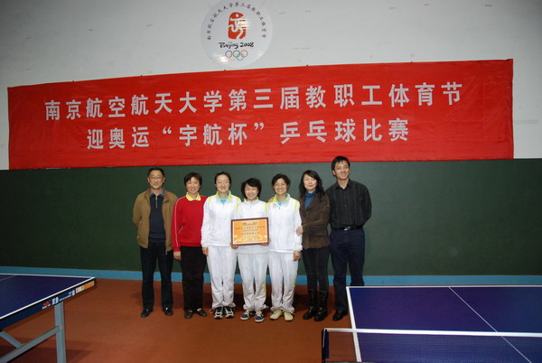 在奥运决胜之年唱响“全民健身与奥运同行”是本次活动的主题。各公司党政工领导高度重视,积极组队踊跃参与,他们既当教练员又当运动员,既当领队又当啦啦队,既场外谋划又上阵冲锋,为圆满顺利地完成比赛奠定了良好的基础。比赛时体育馆内人声鼎沸,“好球!好球!”“扣球,用力扣”一声接一声的叫好、加油声不断传入耳中,赛场上,运动员们个个身手不凡,比赛进行得异常激烈、精彩。特别是男、女组冠亚军争夺赛更是扣人心弦,侧旋、下旋、弧旋……一招一式让人看得眼花缭乱,双方比分交替上升,紧张气氛决不亚于世乒决赛。其他选手也都以精湛的球艺,博得观众阵阵掌声。参加本次迎奥运“宇航杯”教职工乒乓球比赛,共有32支代表队(其中女子代表队15支)。 经过激烈的角逐,获得男子团体前六名的是:校机关、民航公司、航空宇航公司、外国语公司、无人机研究院、人文与社会科学公司;获得女子团体前六名的是:机电公司、航空宇航公司、校机关、无人机研究院、材料科学与技术公司、信息科学与技术公司。校工会向取得男、女团体前六名的代表队表示祝贺!对所有运动员、裁判员及大赛组委会全体工作人员,表示亲切的慰问和衷心的感谢!