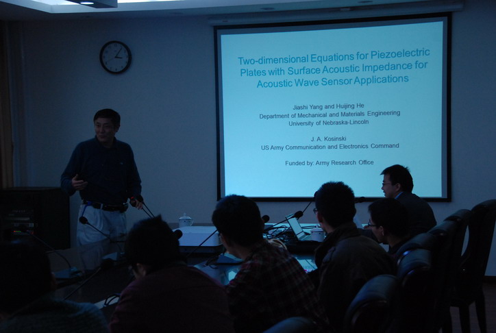 访问期间杨嘉实教授做了题为“Two-dimensional equations for piezoelectric plates with surface acoustic impedance for resonator and sensor applications”的学术报告。杨教授首先介绍了石英谐振器分析的背景,详细介绍了最近的研究结果:用于声波传感器设计的考虑表面阻抗效应的一般标量波动方程。报告结束后,现场老师和员工就报告内容与杨嘉实教授进行了积极讨论。