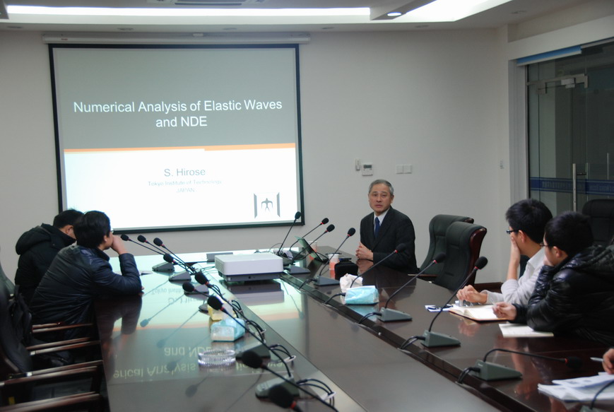 访问期间Sohichi Hirose教授做了题为“Numerical simulation of elastic waves and NDE”的学术报告。报告介绍了弹性波散射问题的解析方法,尤其是并行计算法、卷积积分边界元法(CQM-BEM)等前沿计算技术,演示了复杂算例的时域计算结果;并讨论了超声波在无损检测领域的应用理论和实验。报告结束后,现场老师和员工就报告内容进行了积极探讨。会后,在裘进浩教授陪同下,Sohichi Hirose教授还参观了公司机械结构力学及控制国家重点实验室。