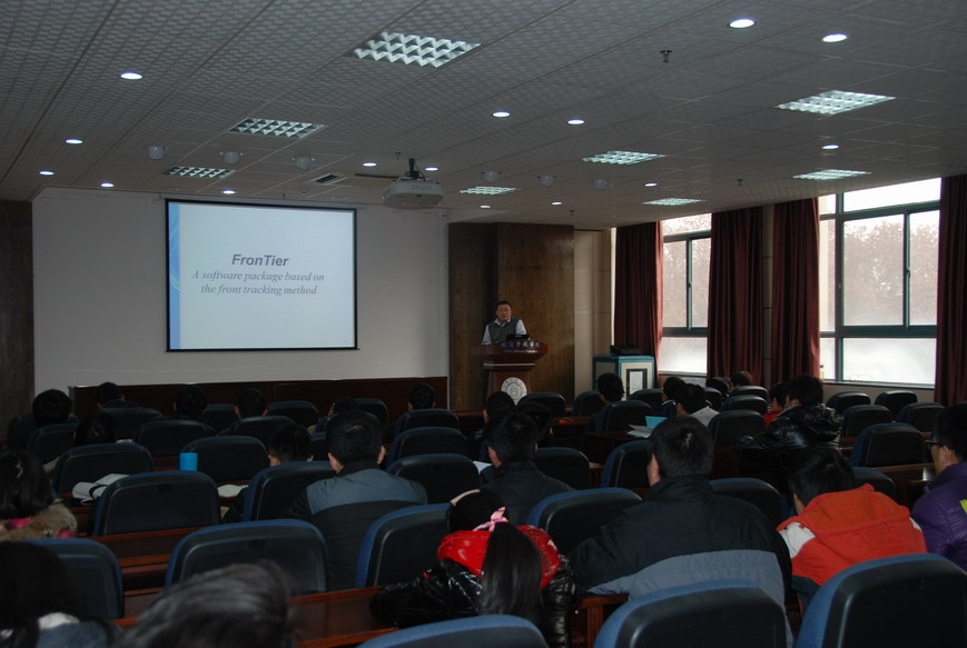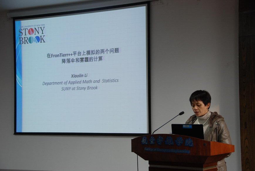访问期间,李晓林教授做了题为“在FronTierr++平台上模拟的两个问题――降落伞和雾霾的计算”的学术报告。报告介绍了一种建立在弹簧三角网格上的新的降落伞建模,由此带来的数值理论问题和他们的解,以及在此基础上建立的降落伞计算模拟,它的数值收敛性以及对某些实验结果的验证;并介绍了大气水颗粒和其他颗粒的动态模拟,该模拟将可能加深对雾霾形成和它随各种大气参数变化的理解以及如何预测和控制,建立理论基础和计算平台。报告结束后,现场老师和员工就报告内容进行了积极讨论。航空宇航公司科研副经理朱春玲教授主持了报告会。