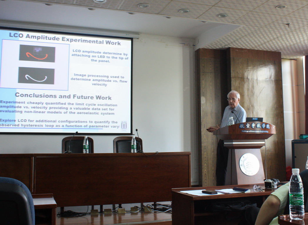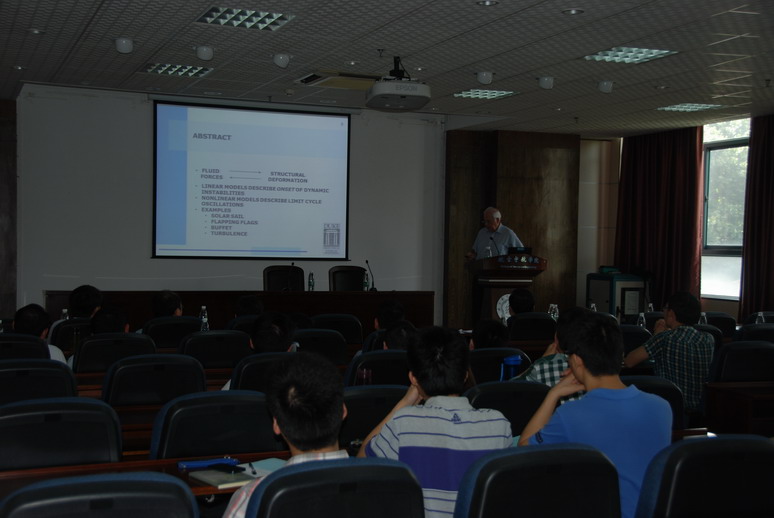 访问期间,Dowell教授做了题为“Nonlinear Dynamics of Fluid and Structural Systems”的学术报告,就非线性气动弹性、基于CFD的非定常气动力降阶建模做了详细的阐述,报告现场Dowell教授与师生就报告内容进行了热烈的交流和讨论。