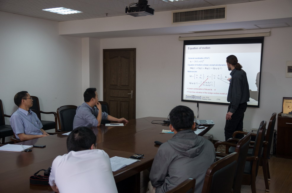 6月18日,AmbrusZelei先生为公司师生做了题为“Experimental determination of aerodynamic forces on flexible supported bridge section model by montecarlo method”的学术报告。报告详细介绍了桥梁颤振问题的建模、动力学分析、及实验验证等方面的研究工作。引起了与会师生的浓厚兴趣,师生们就某些学术问题与Ambrus进行了热烈的讨论,使公司师生获益匪浅。