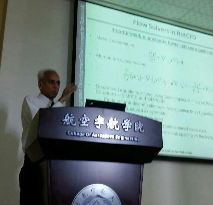 Rajagopalan教授介绍了关于计算流体力学(CFD)基本知识和直升机旋翼流场的基本特性;重点讲述了动量源方法的基本原理、实现及其在直升机旋翼空气动力学、飞行力学研究领域的应用;同时讲座中还通过自主研发的RotCFD软件,展示了动量源方法在解决实际直升机气动问题的能力。报告结束后Rajagopalan教授与在场的师生就相关领域的研究进行了交流和讨论