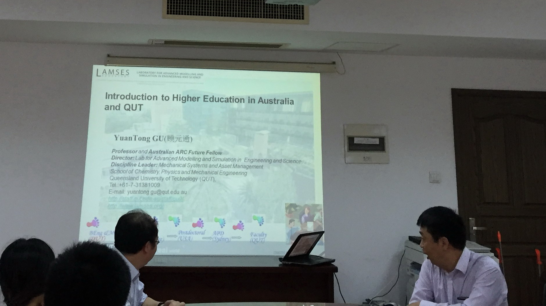 应公司机械结构力学及控制国家重点实验室王立峰教授邀请,澳大利亚昆士兰科技大学化学物理与机械工程公司机械系主任顾元通教授于2016年5月24日至28日访问了公司,并于5月27日为公司师生做题为“Numerical and Experimental Exploration of Mechanical Behaviour of Layered Sodium Titanate Nanowire and a New Diamond Nanothread”的学术报告。报告内容丰富、生动、精彩,介绍了新型一维纳米结构的理论、计算和实验研究,对公司相关科研工作具有借鉴作 用。同时,还结合自己多年的教学、科研经历,讲述了研究生如何做好科学研究、Dynamics课程(对应国内理论力学课程的运动学、动力学部分)教学等若干问题。王立峰教授主持了此次报告会。