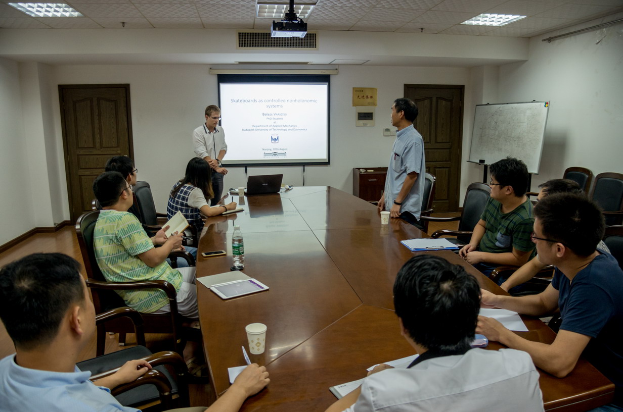 大学应用力学系博士研究生Balazs Varszegi先生于2016年7月28日至8月5日访问了公司,并于8月2日为公司师生做了题为“Skateboards as controlled nonholonomic systems”的学术报告。Varszegi先生介绍了滑板的动力学建模与运动控制设计,重点介绍了在时滞PD反馈作用下滑板的行进速度与人的反应时滞对滑板运动