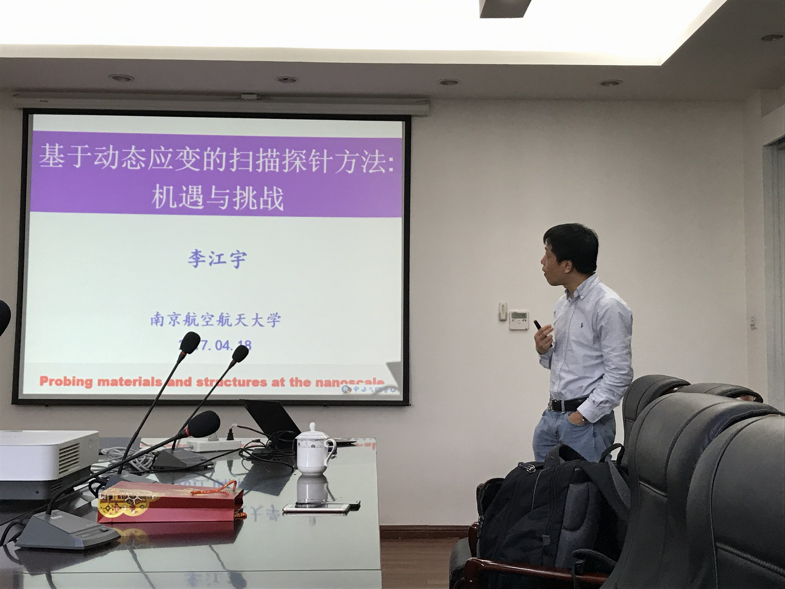 应公司机械结构力学及控制国家重点实验室高存法教授邀请,美国华盛顿大学机械工程公司李江宇教授及石家庄铁道大学赵晋津副教授于2017年4月17日至19日访问了公司,并于4月18日为公司师生分别做了题为“基于动态应变的扫描探针在信息、能源、与生物材料中的应用与挑战”及“钙钛矿太阳能电池材料制备及其力电光耦合性能研究”的学术报告。报告内容丰富、生动、精彩,分别介绍了扫描探针技术的最新发展和太阳能电池领域的进展等内容,对公司相关科研工作具有借鉴作用。朱孔军教授主持了此次报告会。