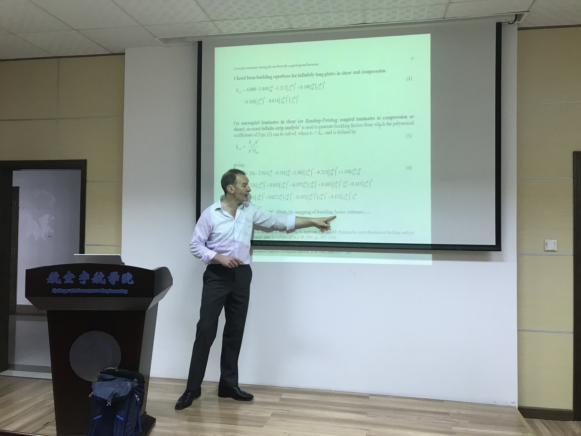 应公司航空宇航公司航空航天交叉研究院郭玉杰老师邀请,英国格拉斯哥大学Christopher Bronn York副教授,于2017年8月21日至9月1日访问了公司,并于8月30日为公司师生做了题为“Effect of bending-twisting coupling on the compression and shear buckling strength of infinitely long plates”的学术报告。报告内容丰富、生动、精彩,介绍了复合材料结构设计中的前沿研究工作,对公司相关科研工作具有借鉴作用。同时,Christopher Bronn York副教授还结合自己多年的研究经历,讲述了复合材料以及复合材料制造技术的发展历史等。郭玉杰老师主持了此次报告会。