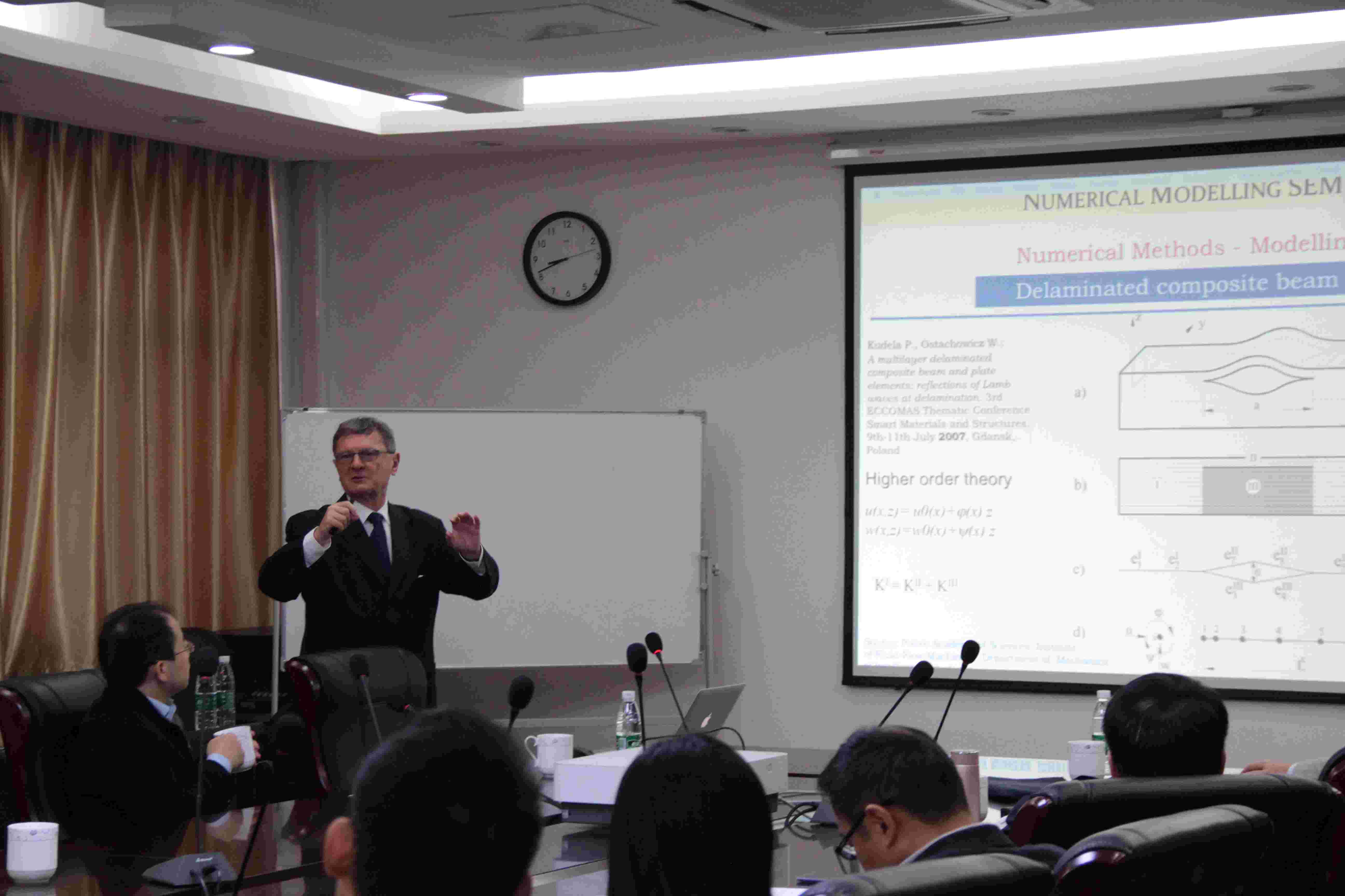 应公司机械结构力学及控制国家重点实验室袁慎芳教授和邱雷教授的邀请,波兰科公司Wieslaw Ostachowicz教授于2017年11月11日至14日来公司进行了学术访问,并于11月13日上午为公司师生做了题为“Non-destructive assessment of structural integrity and failures (for lightweight structures)”的学术报告。报告介绍了结构健康监测及无损检测领域常用的基于激光测振、机电耦合阻尼等监测技术原理及应用,内容丰富、生动、精彩,对公司相关科研工作具有借鉴作用。同时,Wieslaw Ostachowicz教授还结合自己多年的研究经历,讲述了在结构健康监测应用问题的研究体会,分享了研究心得。钱征华教授主持了此次报告会。
