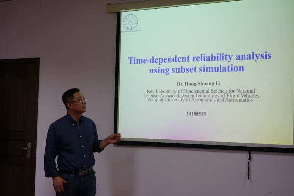 按照校人事处对公派留学回国教师的要求,航空宇航公司飞行器先进设计技术国防重点学科实验室李洪双副教授于2018年5月15日为公司师生做了题为“Time-dependent reliability analysis using subset simulation”的学术报告。报告主要介绍了其在美国密苏里科技大学访问期间所开展的结构机构动态可靠度评估和不确定性优化设计等方面的研究进展。