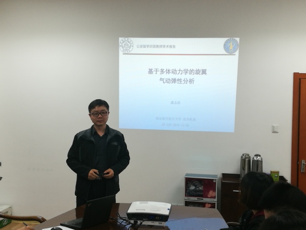 按照校人事处对公派留学回国教师的要求,航空宇航公司直升机旋翼动力学国家级重点实验室虞志浩老师于2018年12月2日为公司师生做了题为“基于多体动力学的旋翼气动弹性分析”的学术报告。报告主要介绍了虞志浩老师在英国格拉斯哥大学访问期间所开展的直升机旋翼气动弹性方面的研究工作,主要包括旋翼多体动力学与气动弹性模型、气动弹性方程高效求解方法、旋翼载荷与稳定性计算等。