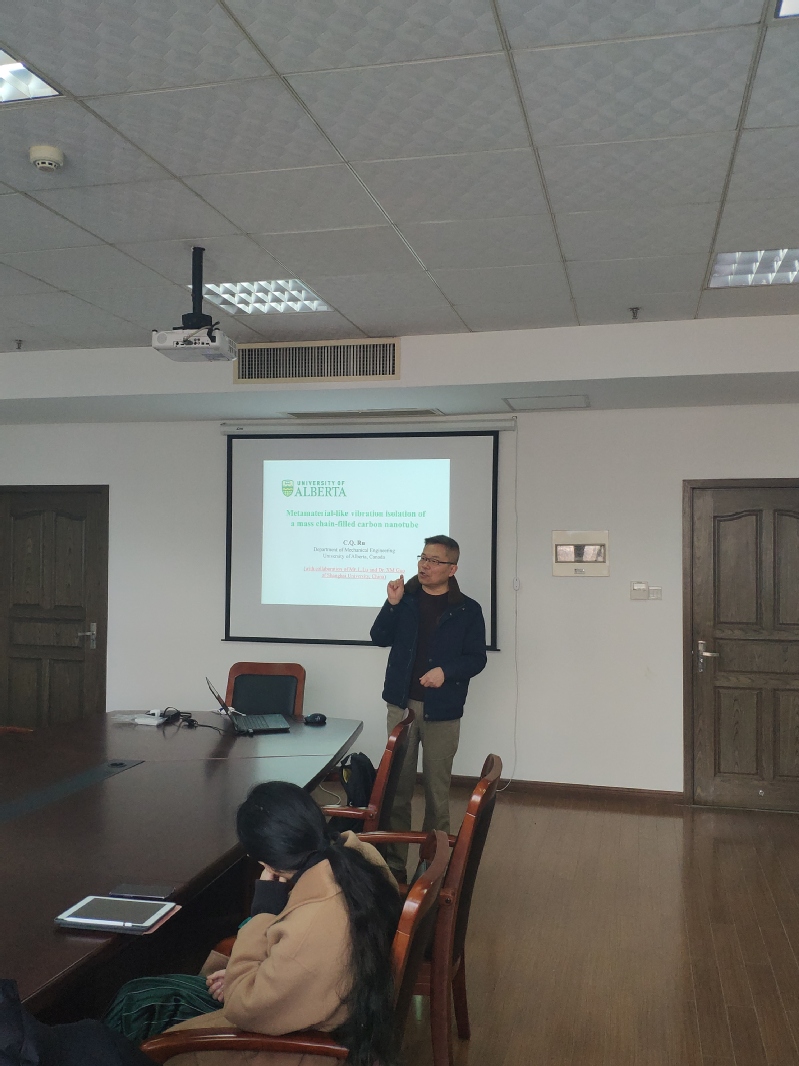 应公司永利3044集团官网机械结构力学及控制国家重点实验室高存法教授的邀请,加拿大阿尔伯塔大学茹重庆教授于2019年2月28日至3月27日将在公司访问交流,并于3月6日做了题为“Metamaterial-like Vibration Isolation of Mass Chain-filled Carbon Nanotubes”的学术报告。报告详细介绍了茹重庆教授在碳纳米管、超材料隔振领域的研究成果和最新进展。报告内容丰富、精彩生动,对公司相关科研工作具有借鉴作用。同时,教授还结合自己多年的研究经历,与现场听众分享了在固体力学领域的研究心得和体会。戴明讲师主持了报告会。据悉在接下来的三周时间,茹教授会在永利3044集团官网开展固体力学专题讨论班,欢迎全校师生前来互相讨论、学习。