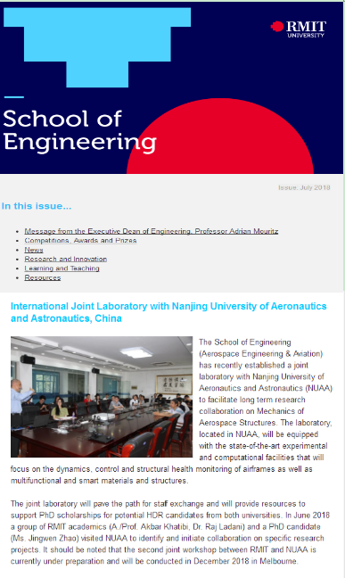 澳大利亚皇家墨尔本理工大学工程公司时事通讯2018年7月刊报道了“航空航天结构力学”国际合作联合实验室的共建情况。