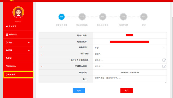 团员登录系统进入个人中心,点击左侧“关系转接”菜单。