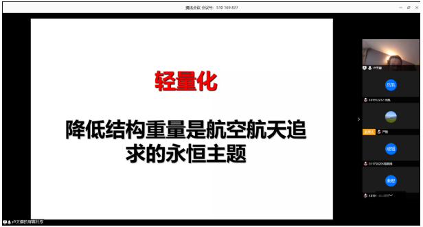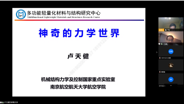第二个模块,卢天健老师回顾了自己的海外求学经历,又详细介绍了自己的主要研究方向——轻量化,他表示降低结构重量是航空航天追求的永恒主题,并先后介绍了结构轻量化的意义与应用、生物多孔结构。卢老师从20年前开始研究超轻多孔材料和结构,他详细介绍了多孔金属的四个多样化特征和在交通运载工具、航天工程、现代化国防方面的需求,同时,卢老师还介绍了自己的研究思路:立足力学,开展多学科交叉研究,并向大家展示了他带领团队承担的项目情况和取得的主要成绩。第三个模块,卢老师用丰富多样的例子展现了“无处不在的力学”,包括手机触摸屏的力学、微电子力学,还有一些平常难以与力学联合在一起的研究内容,如皮肤热-力-电耦合理论、含液多孔生物材料、神经力学等。卢老师特别指出力学的终极目标是脑科学,而他本人新的研究方向也是大脑的防护力学。一系列介绍颠覆了员工对于力学的传统认知!卢老师表示,他十分注重本科生的培养,并且“晒”出了他指导的本科生进行的研究情况和取得的成就,卢老师鼓励员工勇于挑战,他也欢迎同学们到他的实验室参观,与他交流。最后,卢老师留下了对长空学子的寄语:搏击长空,追梦力学!