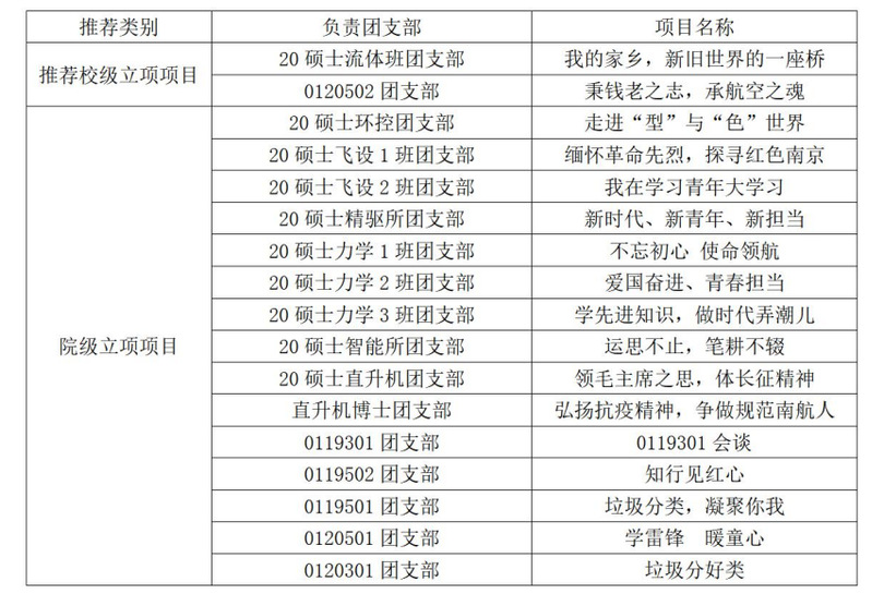 经过前期支部申报、院团委审核,现确定推荐公司20硕士流体班团支部、0120502团支部的申报一支部一项目推荐到校级立项,配备每个项目800元的建设经费支持(经费使用范围包括支部活动中产生的资料、交通、门票等);其他15支项目作为院级立项,并配备每个项目600元的建设经费支持,现予以公示: