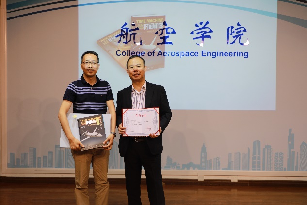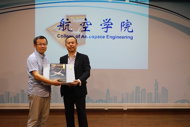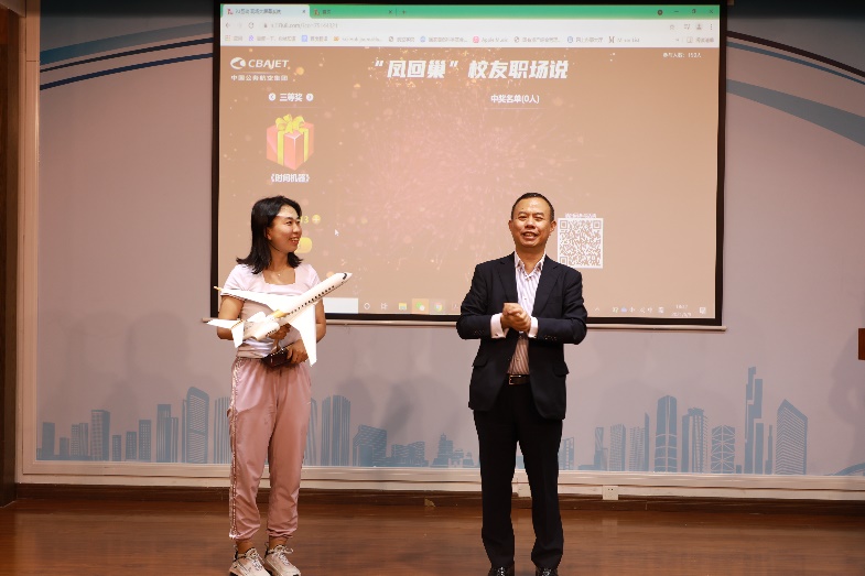 交流会会场气氛热烈,全程两个小时,同学们热情踊跃,提出很多问题,廖总都非常详细的做了解答,廖总还代表中国公务航空公司给参会员工颁发了奖品,包括廖学峰主编的《时间机器》和《私人订制》以及飞机模型。