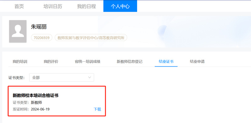 满足结业条件的教师请于7月25日前登录“教师一体化培训平台”(http://jspx.nuaa.edu.cn/web)--个人中心—结业申请—新教师结业,完成“微课”(同第3点中的微课作品)和“心得”(模板见附件3)上传,并点击申请结业。公司将在9月前统一审核,审核通过后教师可自行在结业证书里下载电子版校本培训证书,不再发放纸质证书。