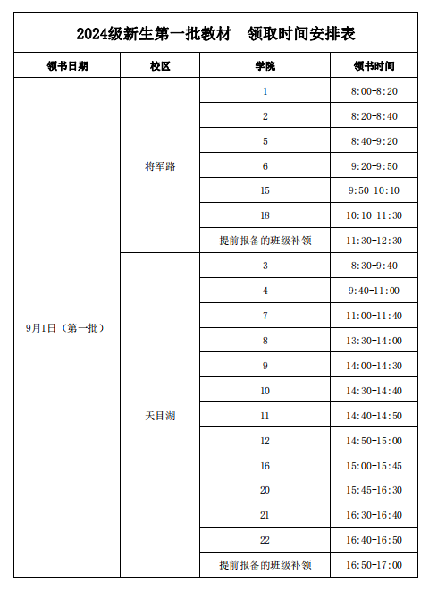 根据2024级新生报到时间安排,现对2024-2025学年第一学期将军路、天目湖校区教材(第一批)集中发放做如下安排:
