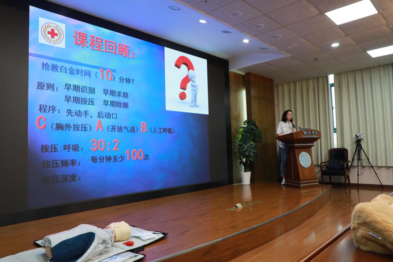 陈晓梅对实验室中涉及人身安全的突发事件进行了总体说明,并对触电、烧烫伤、化学毒物伤害等事件的危害、现场救护原则、现场处置技能与禁止事项做了详细的介绍。陈晓梅着重介绍了CPR现场心肺复苏术操作技能。