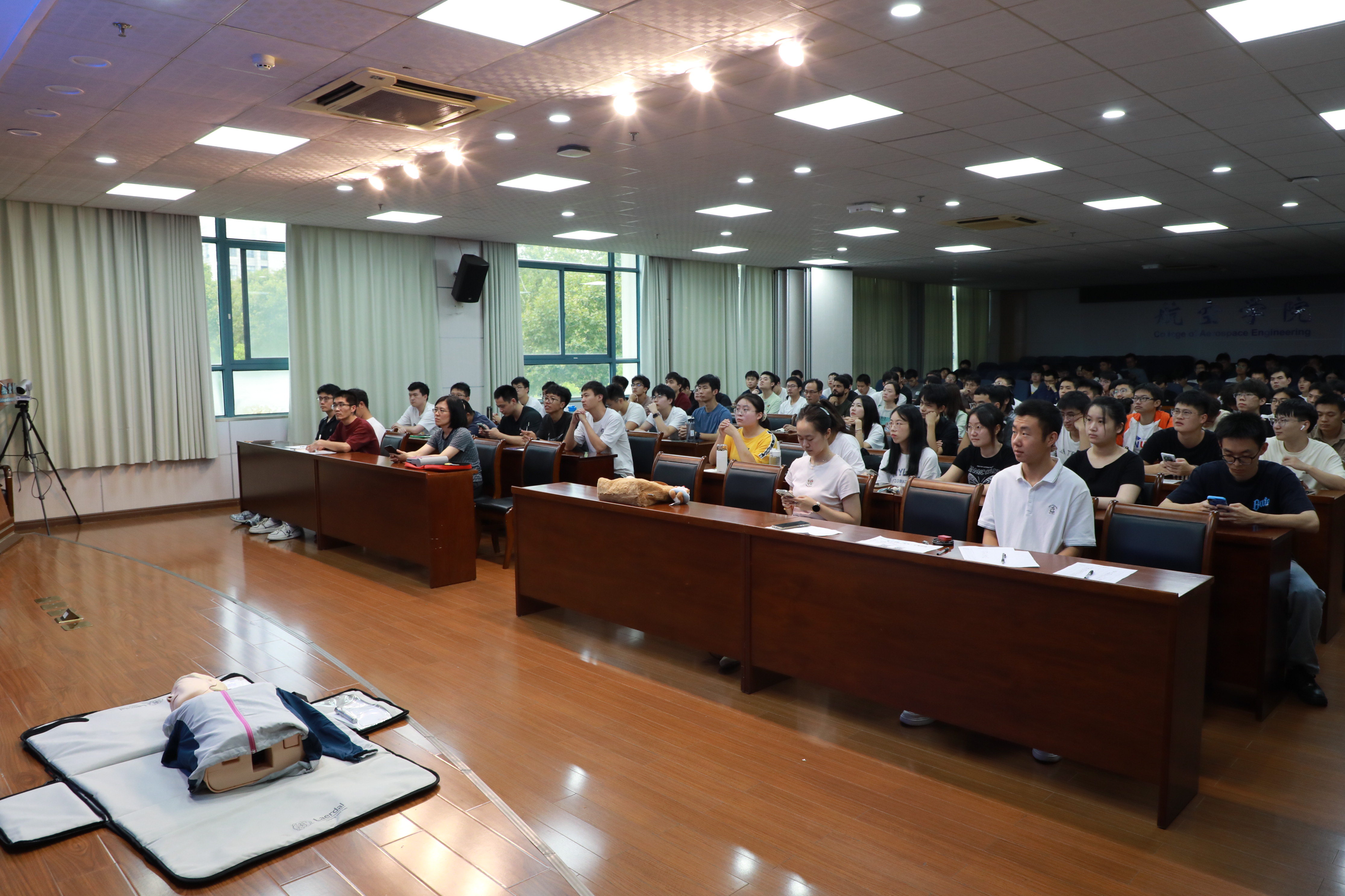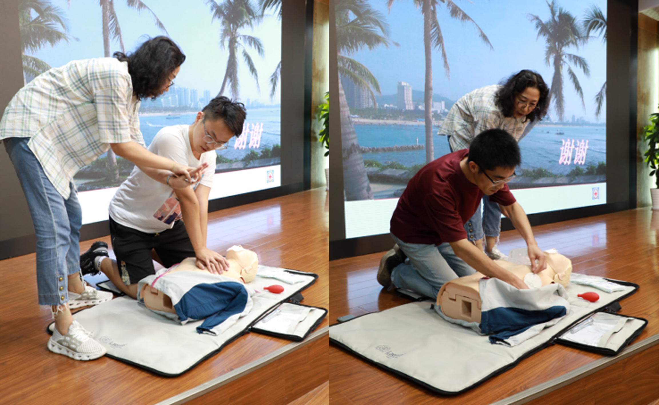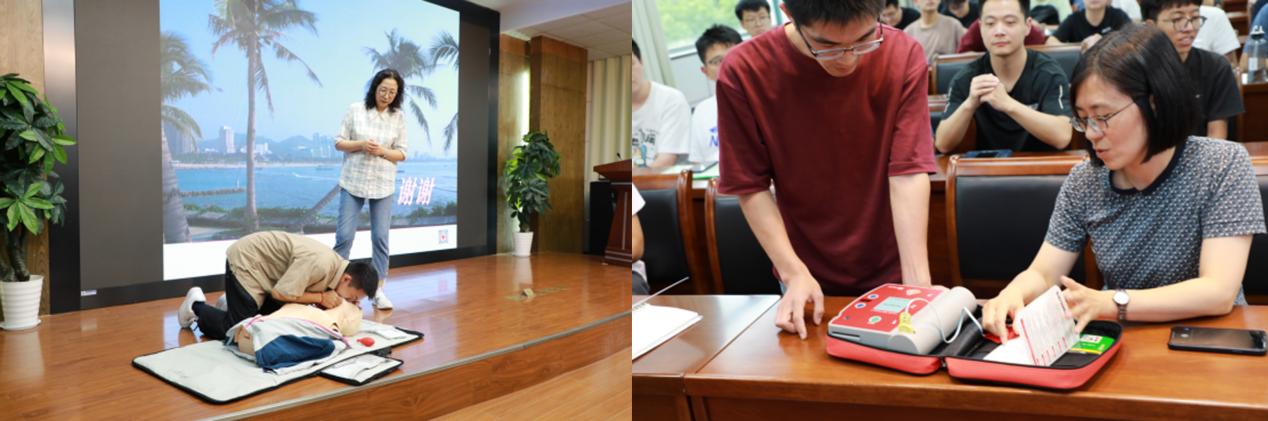陈晓梅利用人体模型对CPR现场心肺复苏术技能进行了演示,屈小燕展示了AED自动体外除颤器及常见防护用品的用法。现场师生代表利用人体模型进行了心肺复苏操作。
