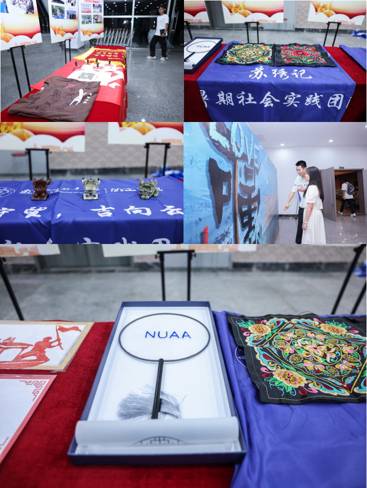 值得一提的是,在活动现场外还布置了社会实践成就展览区,展示了多个重点团队的文化创意,包括文创产品、手绘工艺、摄影图片等作品,让实践赋能成长,让文明风尚在基层生根发芽。