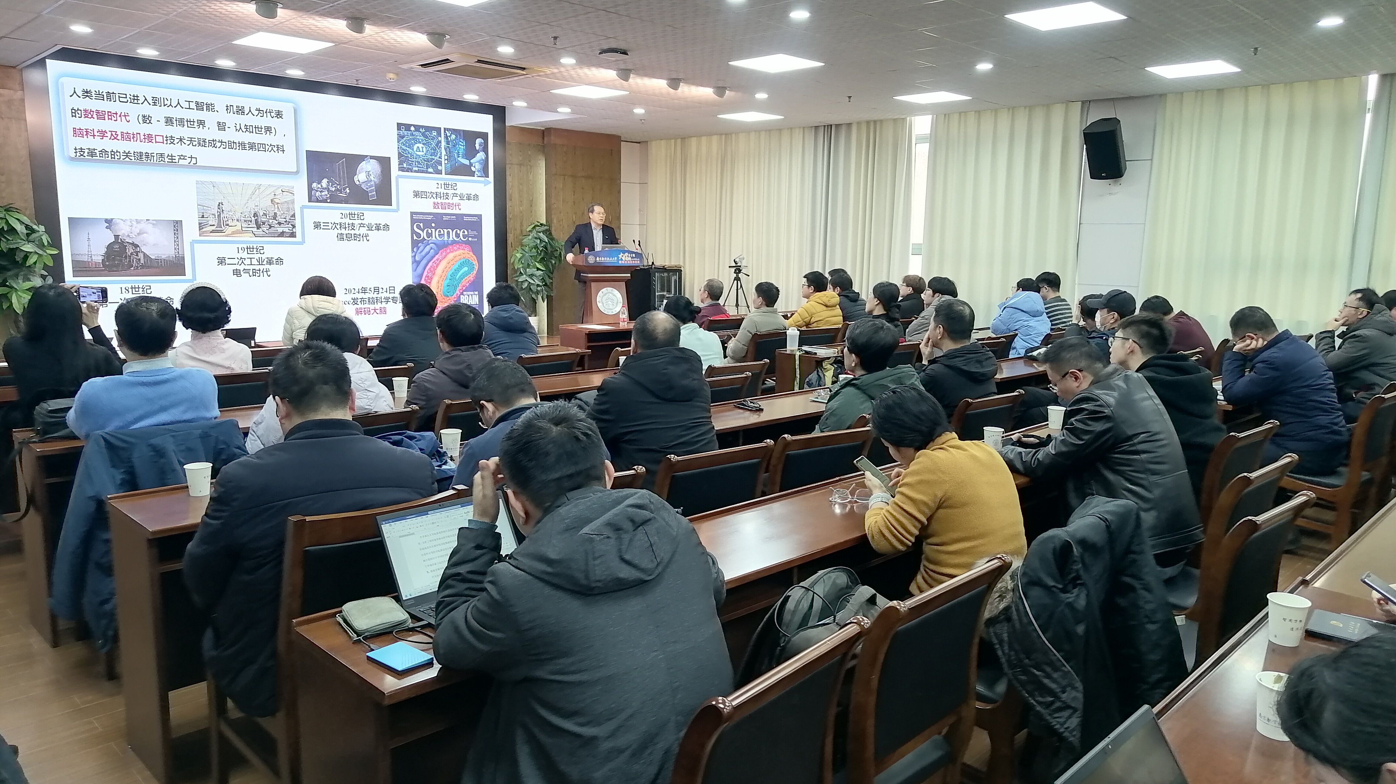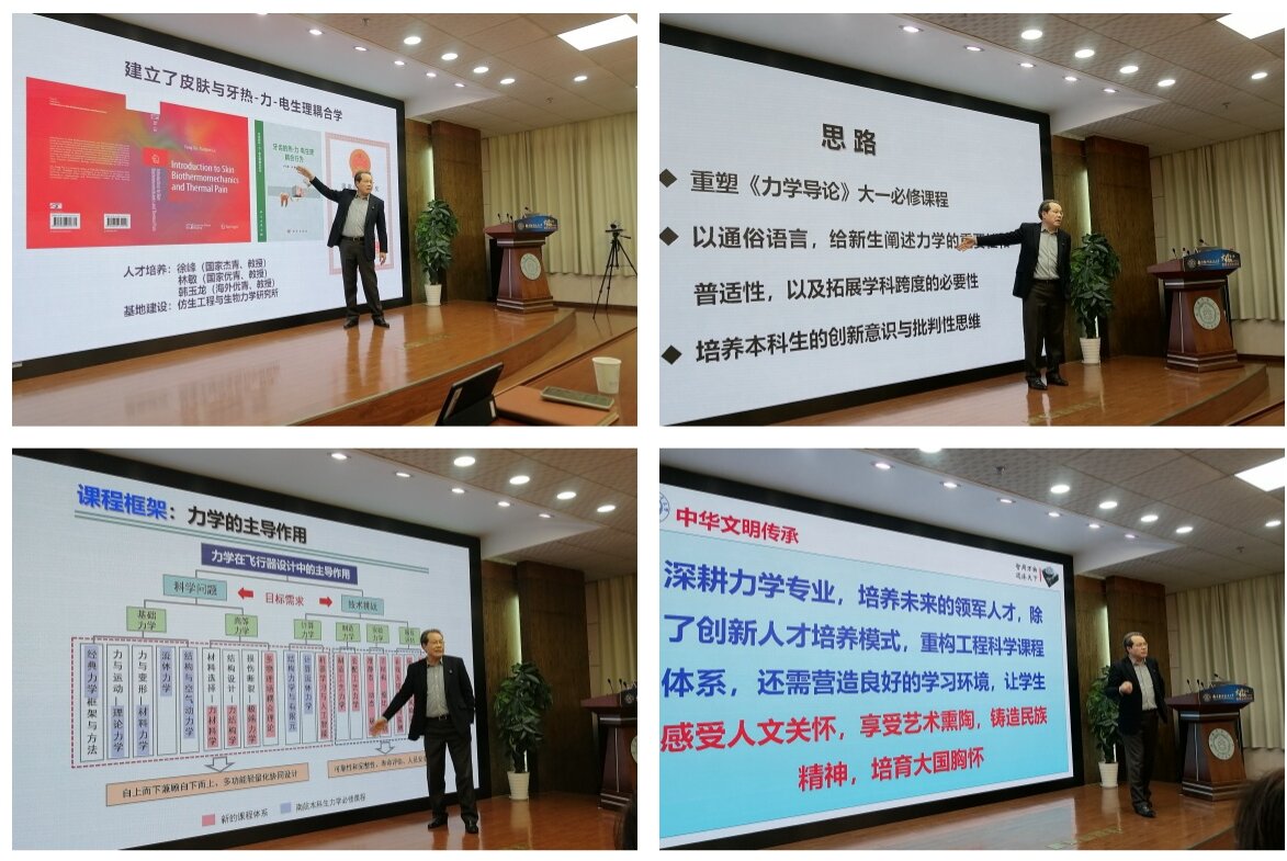 卢天健教授首先分享了他初到剑桥大学任教时,确定从超轻多孔金属材料力学行为到超轻多孔结构跨尺度力-热-声理论学科交叉研究的心路历程;继而,突破传统超轻多孔材料和结构力学领域,将研究拓展到以皮肤、牙等多功能生物超结构的热-力-电生理学耦合学交叉领域,相关成果获2015年国家自然科学二等奖(排1);最后,在以大数据、人工智能等为代表的数智时代,卢老师又将研究拓展到颅脑交叉力学前沿方向,牵头申报的国家外专局“脑组织热-力-电生理耦合理论及应用”学科创新引智基地、江苏省基础研究重点项目“基于无创脑机接口的脑神经调控机制及应用”等成功立项。