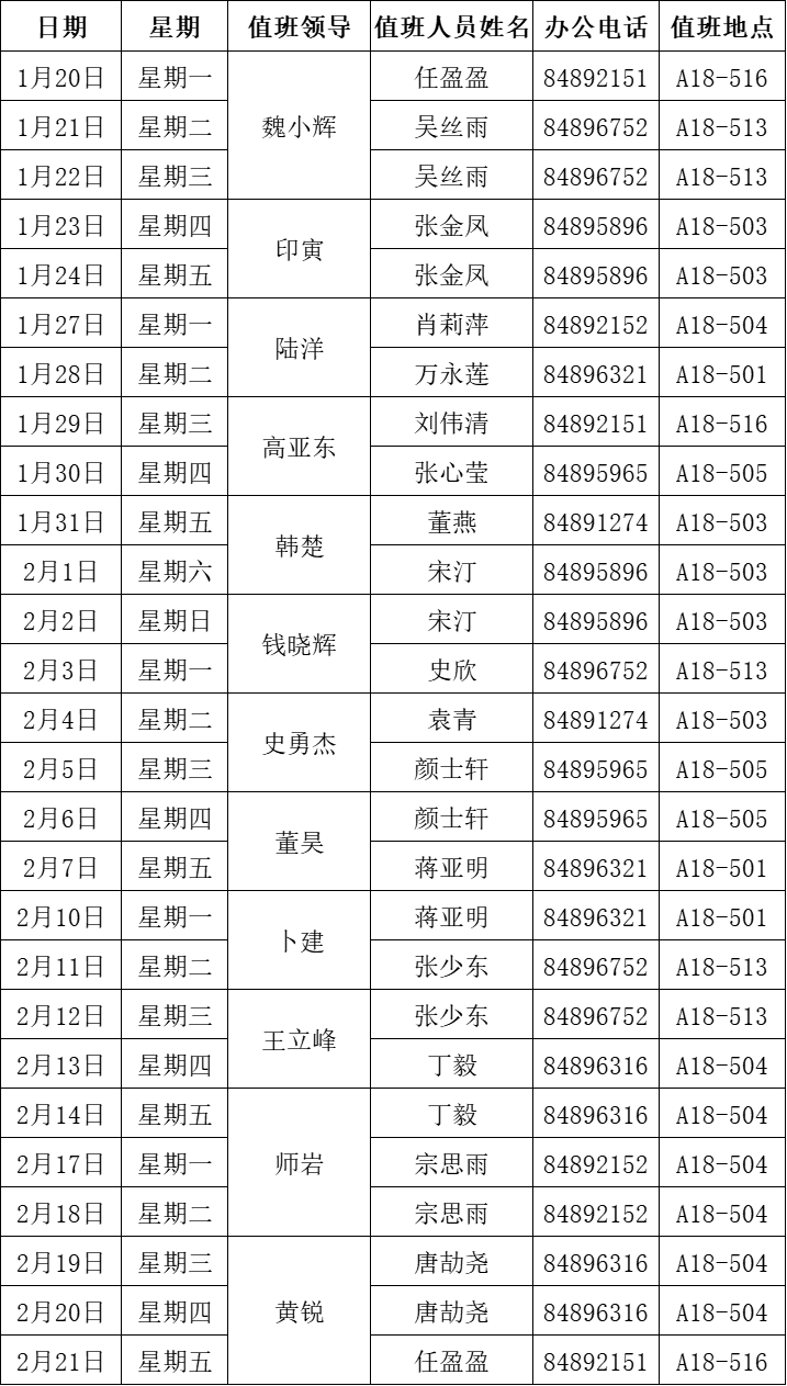 集团总值班自 1月 19日至 2月 22日止,二级单位值班自 1月20 日至 2 月 21 日止(周一至周五及法定节假日)。