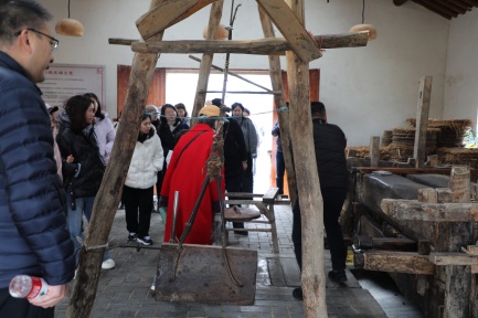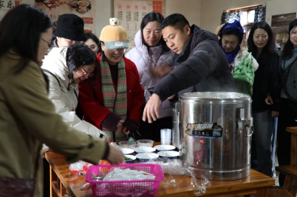 活动当日,阳光和煦,春风拂面。首先,女教工们漫步在“青山渔村”的美丽乡村中,跟随讲解员漫步在石砖路上,参观非遗手工工坊,品尝手磨豆浆和豆腐脑,在油坊里触摸老农具,在河边体验水车汲水,随处感受着农耕文化的传承。