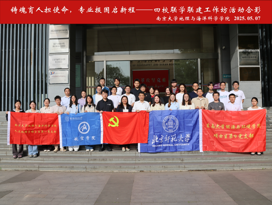 为深入贯彻新时代高公司党建工作要求,切实增强研究生思政教育管理工作的引领力,2025年5月7日,航空公司党委副书记韩楚一行参加南京大学地理与海洋科学公司主办的“铸魂育人担使命,专业报国启新程”四校联学联建工作坊,与北京师范大学、南京大学、东南大学师生代表共同交流研讨研究生样板党支部建设经验。