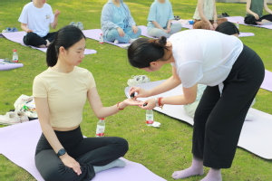 春日的校园里,阳光温柔地洒落,草坪如茵似毯。20名研究生在现场工作人员的指引下,陆续领取了蒸汽眼罩、体验卡、瑜伽垫等活动用品,准备开启一场心灵探索之旅。