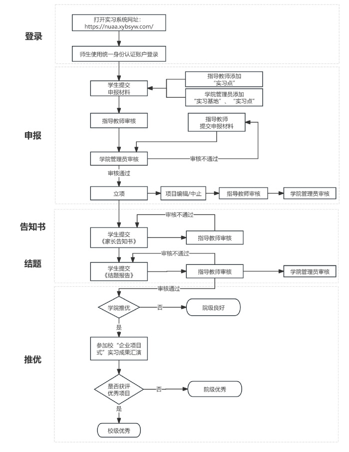 所有“企业项目式”实习的申报立项及相关管理工作均在“实习教学管理系统”内进行,相关业务流程如图1所示。系统网址为:https://nuaa.xybsyw.com/,师生使用统一身份认证账户进行登录,相关系统操作说明详见附件2。