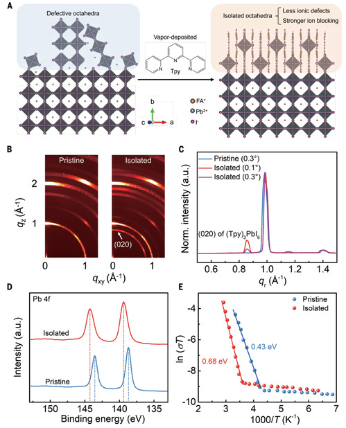 在钙钛矿太阳能电池中,可逆和不可逆的离子迁移都会发生,其中不可逆的离子迁移是由于移动离子在老化应力的共同作用下从钙钛矿层迁移到电荷传输层或电极。这种迁移可能导致设备性能的永久性损害。为了减少不可逆的离子迁移,小面积单元电池的主要策略包括钝化表面缺陷以减少移动离子通道的数量,以及在界面处插入屏障层以抑制离子运动。研究表明,靠近钙钛矿表面的[PbI6]4−八面体通常比晶体内部的缺陷更多,这使得这些区域特别容易受到不可逆卤素离子迁移的影响。对于大面积的钙钛矿太阳能电池,必须限制钙钛矿吸收层内的离子迁移。通过隔离缺陷八面体并同时通过重构钙钛矿表面结构来减少离子通道,可以提高钙钛矿太阳能模块的户外运行稳定性。