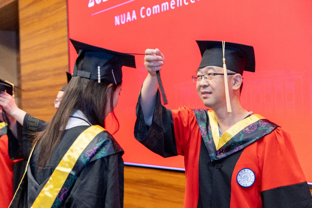 学位授予仪式环节,王立峰、董昊、史志伟、郭宇锋为毕业生拨正流苏、颁发学位证书。