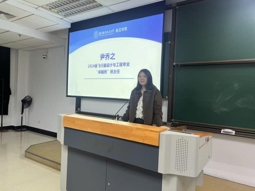 随后,尹乔之教授表示非常荣幸能担任卓越班的班主任,对历届卓越班取得的优异成绩表示充分肯定,并表示有信心带领大家向着更高的目标奋斗。她通过分享自己就读飞设专业的经历,为同学们介绍了多种研究方向。她希望同学们能尽快选择自己未来的发展路径,积极主动与导师进行沟通联系,及早进入大创和导师课题组进行科研训练,以真刀真枪的模式提高自己的学习能力和科研水平。
