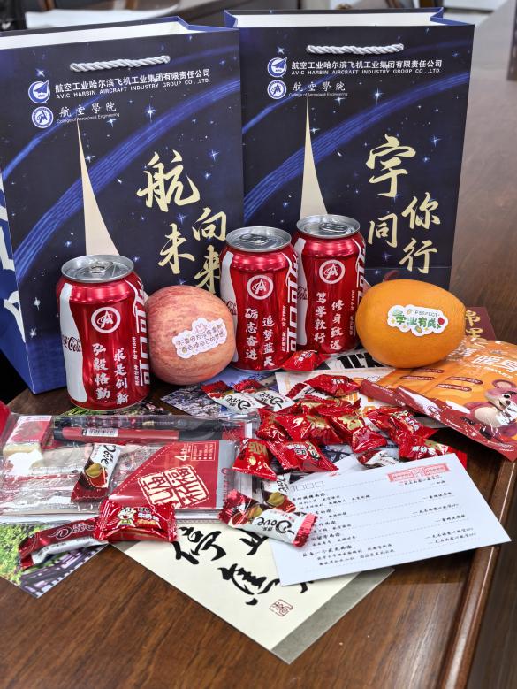 慰问团队不仅带来了公司的关怀,还特意准备了丰富的温暖礼包,礼包由中航工业集团哈飞公司赞助,包括文具套装、院风院训定制可乐、水果、暖身贴、零食等物品,寓意着“苹”稳上岸、心想事“橙”、温“暖”守护、妙“笔”生花。礼包内还放置了公司师生的祝福明信片,每一份礼物都寄托着公司、哈飞对学子们深切的祝福与支持。收到礼包的同学纷纷表示,这份冬日里的惊喜让他们倍感温暖,也更加坚定了前行的信心。