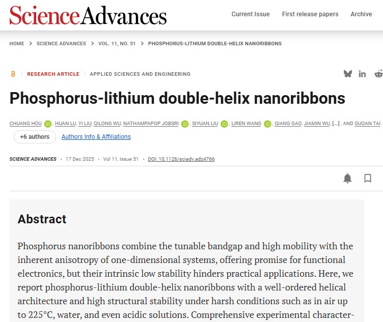为攻克这一关键难题,永利3044集团官网郭万林教授、台国安教授与东京大学Naoji Matsuhisa副教授联合指导的中日合作团队,将原子级结构设计作为核心策略,开展了创新研究。团队成功构筑出一种在无机材料中极为罕见的“磷-锂双螺旋纳米带”全新结构,并系统揭示了其内在的优异环境稳定性、可调光学性质与独特的光热功能。该研究为从本征层面实现低维磷材料的性能与稳定统一提供了全新范式,相关成果以“Phosphorus-lithium double-helix nanoribbons”为题发表于国际顶级期刊 Science Advances。