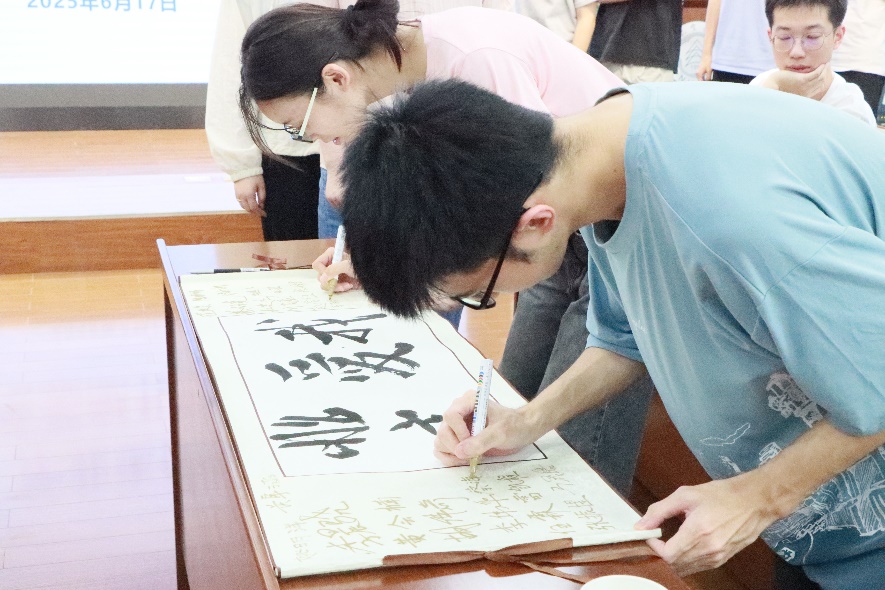 “廉洁修身扬正气,航空报国守初心”,毕业生党员邓瑞睿饱蘸浓墨,在宣纸上挥就苍劲有力的廉政箴言。同学们依次在作品旁签名留念,将“爱我航空”的赤子情怀与“清廉自守”的庄严承诺融为一体。这帧凝聚着师生心血的书法作品,不仅是对公司“砺志奋进,追梦蓝天”院训的文化诠释,更成为毕业生廉洁宣誓的生动注脚。
