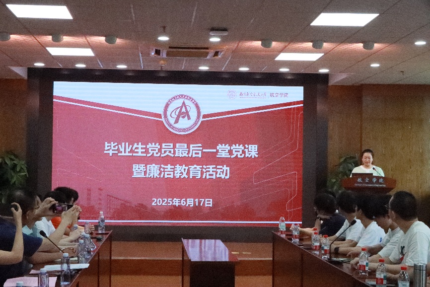 宋璐瑶以《廉洁修身立初心青春破浪赴新途》为题讲授专题党课,紧扣毕业生职业发展实际,引导同学们从三个维度筑牢思想防线:一要坚定理想信念,在航空报国实践中淬炼“风雨不动安如山”的政治定力;二要树立终身学习理念,兼顾廉洁素养与专业能力双提升;三要严守纪律底线,抵制不良风气,永葆清正廉洁的政治本色。